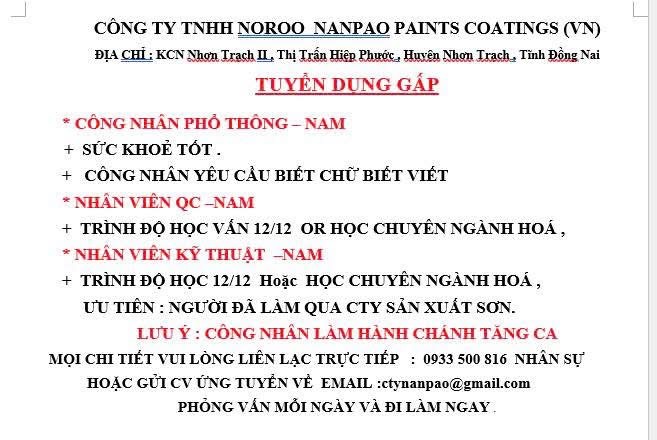 công ty TNHH khuôn mẫu chính xác shilin việt nam. công ty có 100% vốn nước ngoài. chuyên gia công cơ khí chính xác. cần tuyển: -lao động phổ thông. lương 8-12 triệu